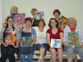 This is our class: top l to r -Joanne, Lynda, Michelle, Karen, Debbie, me, Kirsten and Pat. My kids are all holding their favorite painting from the week. It was a blast and I hope to be able to do it again next year. Michelle was the successful bidder for my painting "Gabrielle" from my last post -the silent auction over it was quite vigorous. I am really glad that she got it. I understand that she has some cool plan to hang it from a large metal wall piece -would sure love to see that.